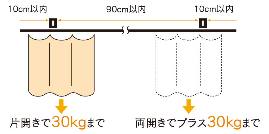 ブラケットとブラケットの間隔は90cm以内、端から1個目のブラケットまでの間隔は10cm以内にしてください。
